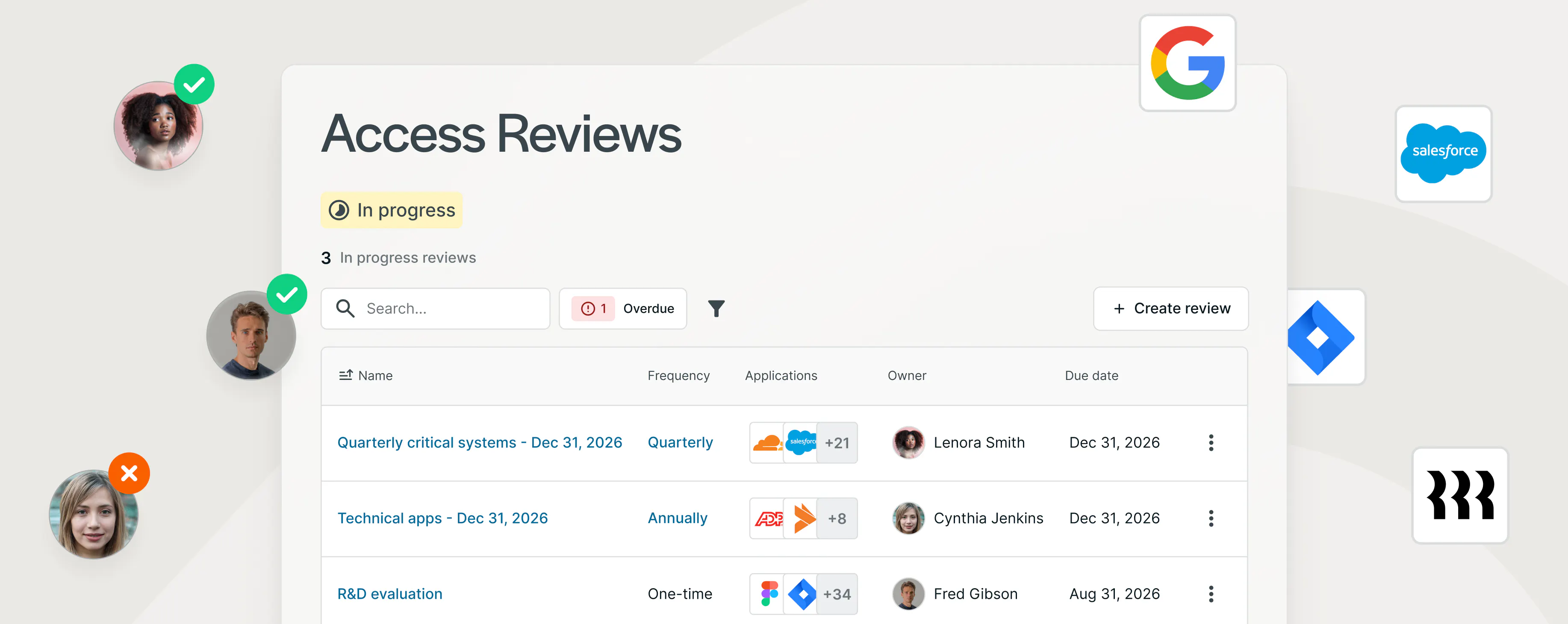 Before a review begins, each system needs a designated reviewer. Different systems can have different reviewers within the same review, so access decisions stay close to the people who understand the business context. Reviews can run once or repeat on a set cadence, while built-in reminders and clear status indicators reduce the need for manual follow-up and make it easier to keep reviews on schedule.