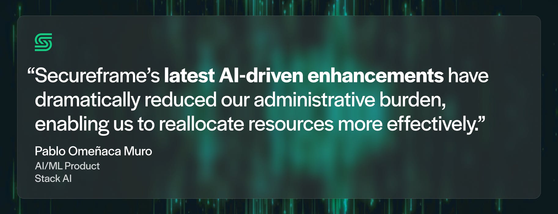 This week, Secureframe reinforced its position as the leading AI compliance platform by announcing significant enhancements that align with the growing demand for smarter, faster, and more efficient compliance processes. As AI becomes increasingly integral to compliance, Secureframe is pioneering the way forward with innovative solutions designed to save time, reduce manual effort, and minimize the risk of human error for organizations looking to strengthen their security and compliance programs.