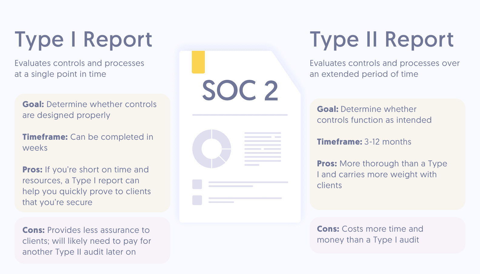 Der Hauptunterschied zwischen den Arten von SOC-Berichten ist der Zeitraum, der in der SOC-Prüfung abgedeckt wird, und der Detaillierungsgrad im Abschlussbericht. Während SOC 2 Typ I Prüfungen die Kontrollen eines Unternehmens zu einem bestimmten Zeitpunkt untersuchen, analysieren SOC 2 Typ II Prüfungen, wie gut diese Kontrollen im Laufe der Zeit funktionieren.