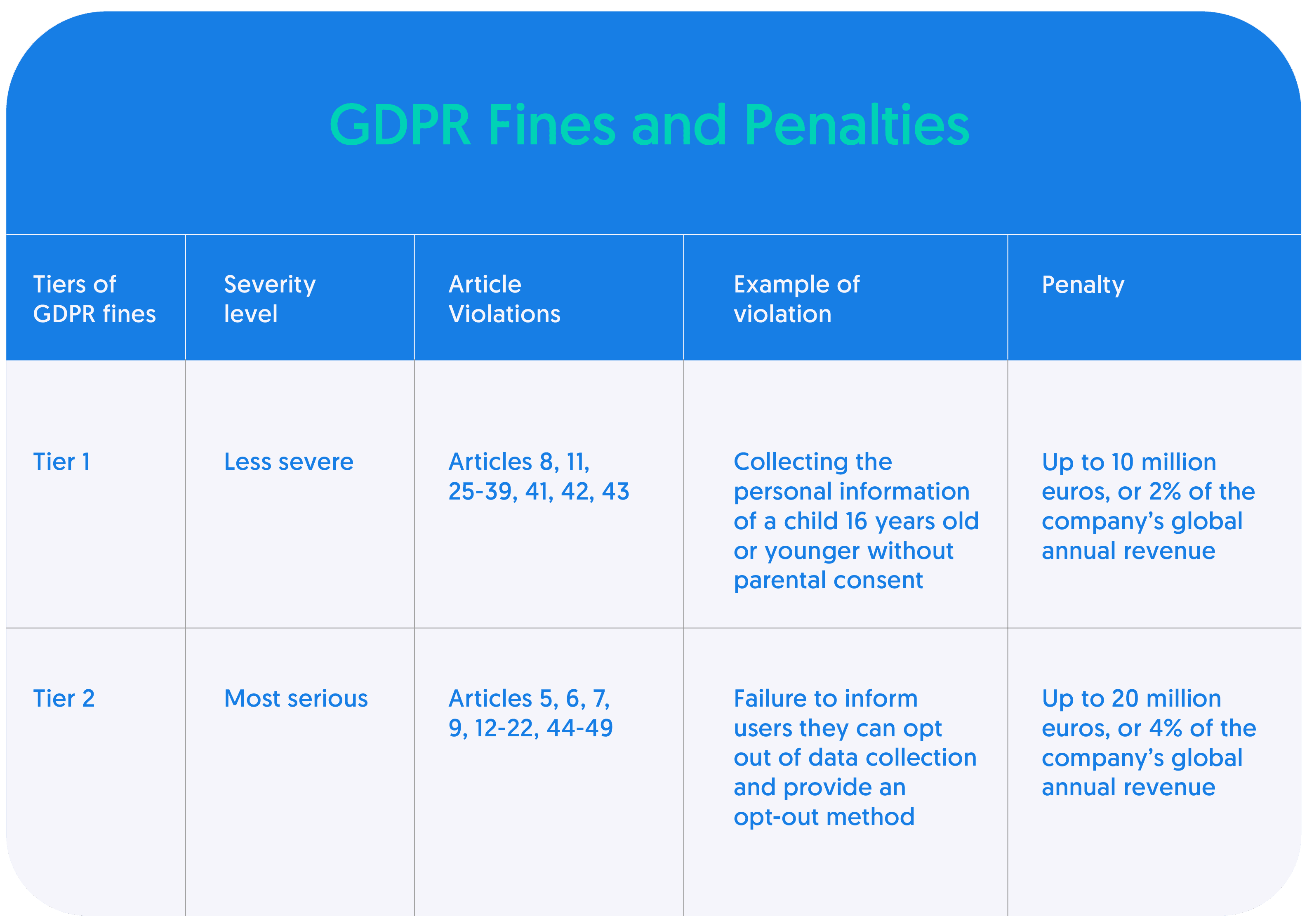 - Tier 2 for more severe violations: Can result in fines of up to 20 million euros, or 4% of the company’s global annual revenue from the previous financial year, whichever is higher