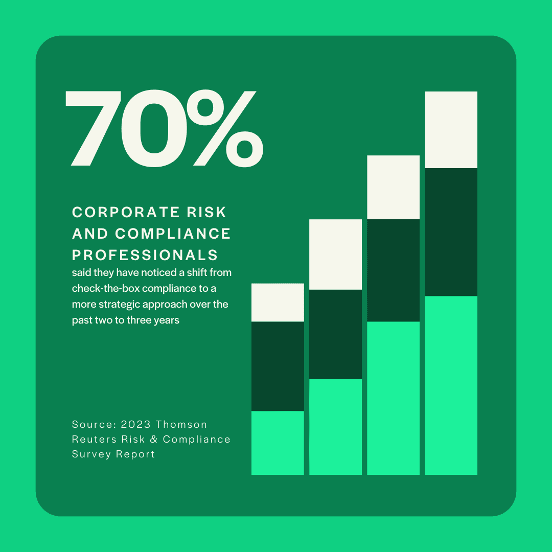 1. El 70% de los profesionales corporativos de riesgo y cumplimiento dijeron que han notado un cambio de cumplimiento de marcar la casilla a un enfoque más estratégico en los últimos dos a tres años. (Informe de Encuesta Thomson Reuters sobre Riesgo y Cumplimiento 2023)