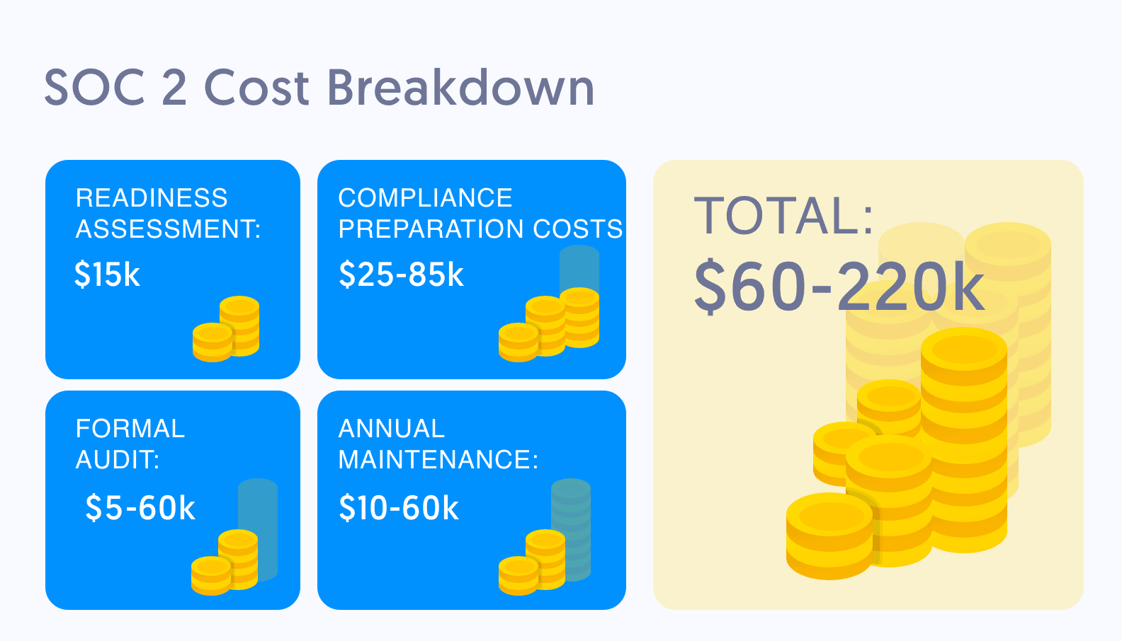Para la auditoría sola, puedes esperar que el costo de SOC 2 Tipo 1 sea alrededor de $10-20k, mientras que el costo de SOC 2 Tipo 2 es en promedio $30-60k.