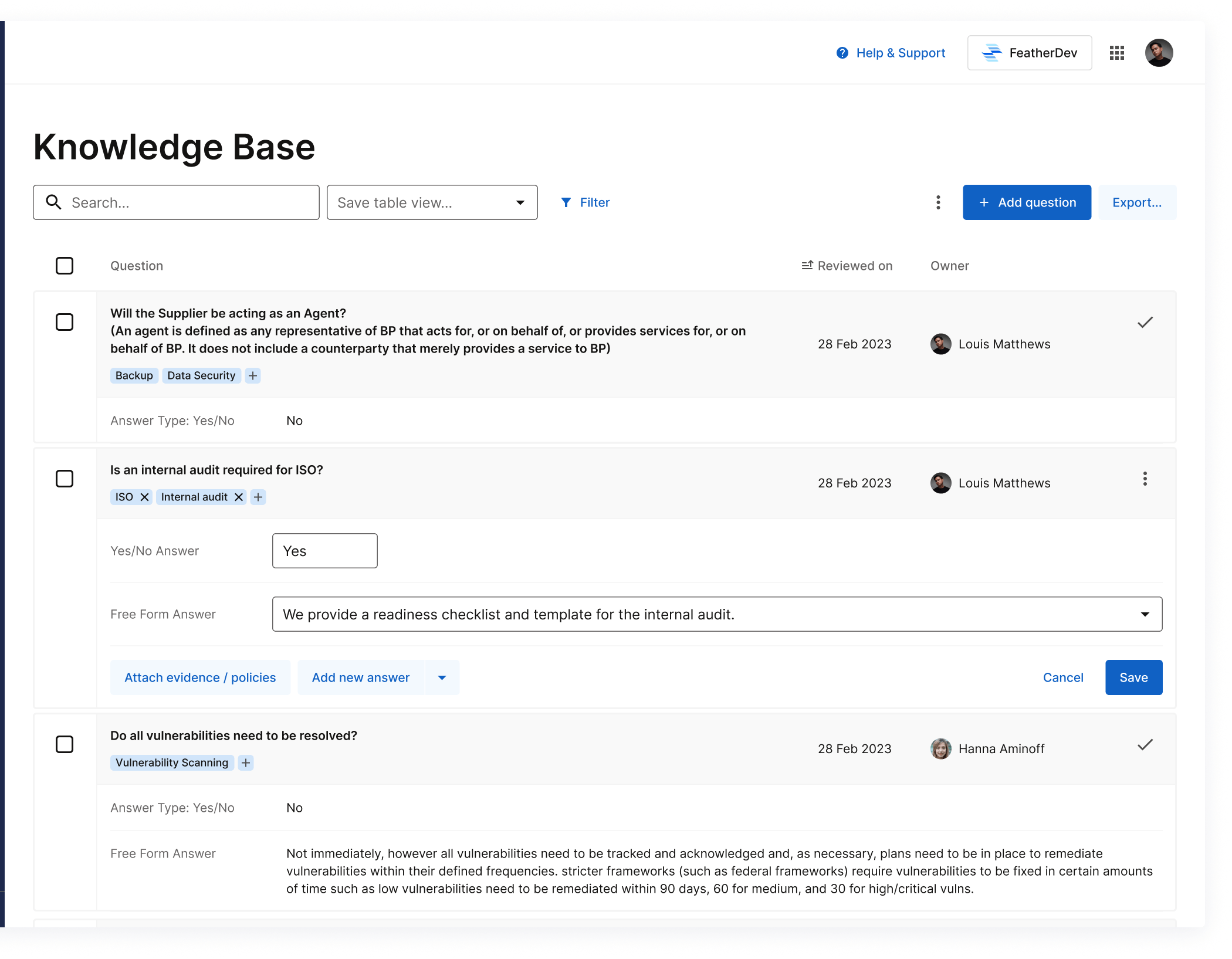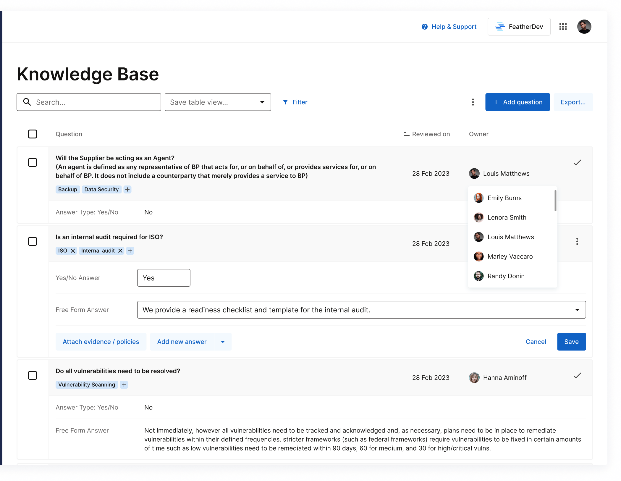 Subject-matter experts can be assigned to answer specific questions in the Knowledge Base to ensure they are kept as up-to-date and accurate as possible. You may also attach evidence or policies to content in the Knowledge Base as additional context.