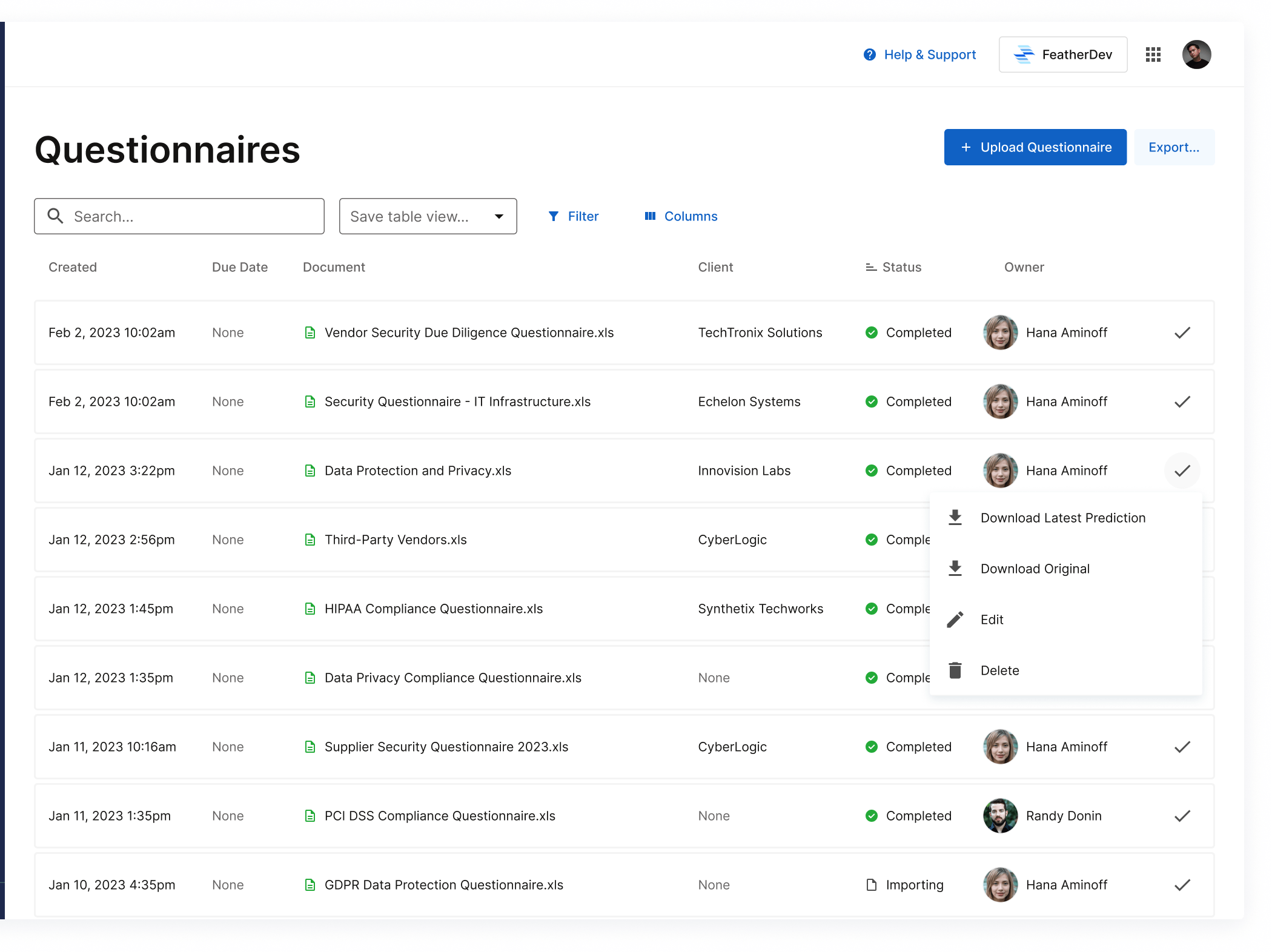All questions and answers that come through your questionnaire workflow can be accessed and edited in the Knowledge Base. Any updates to content will be reflected in the next questionnaire you process in Secureframe.